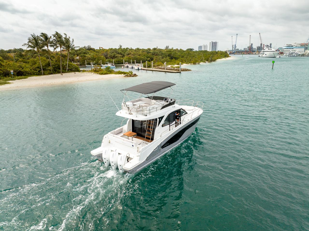 Fra agter til stævn opleves et fantastisk flow med brede passager, en stor siddegruppe i cockpittet og en komfortabel solseng i stævnen. Svømmeplatformen agter giver nem adgang til vandet.