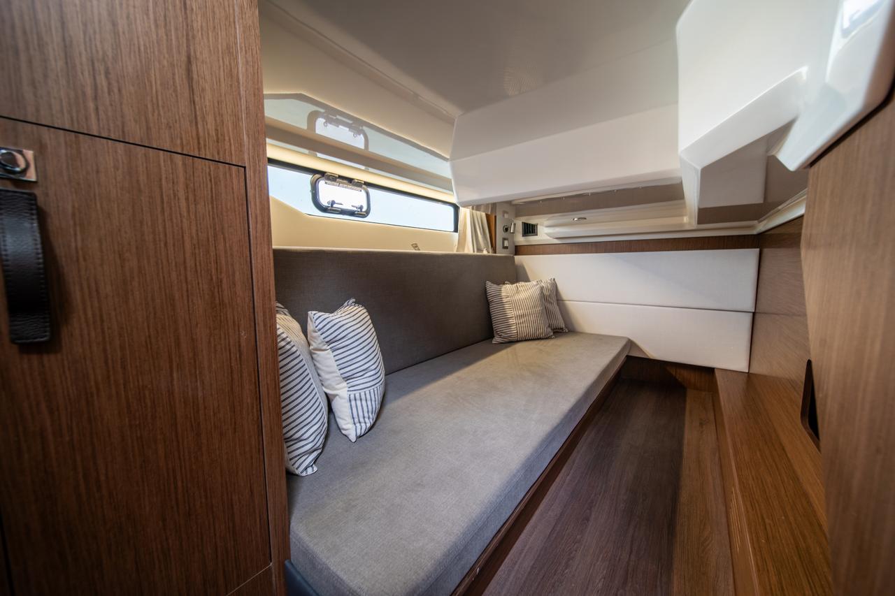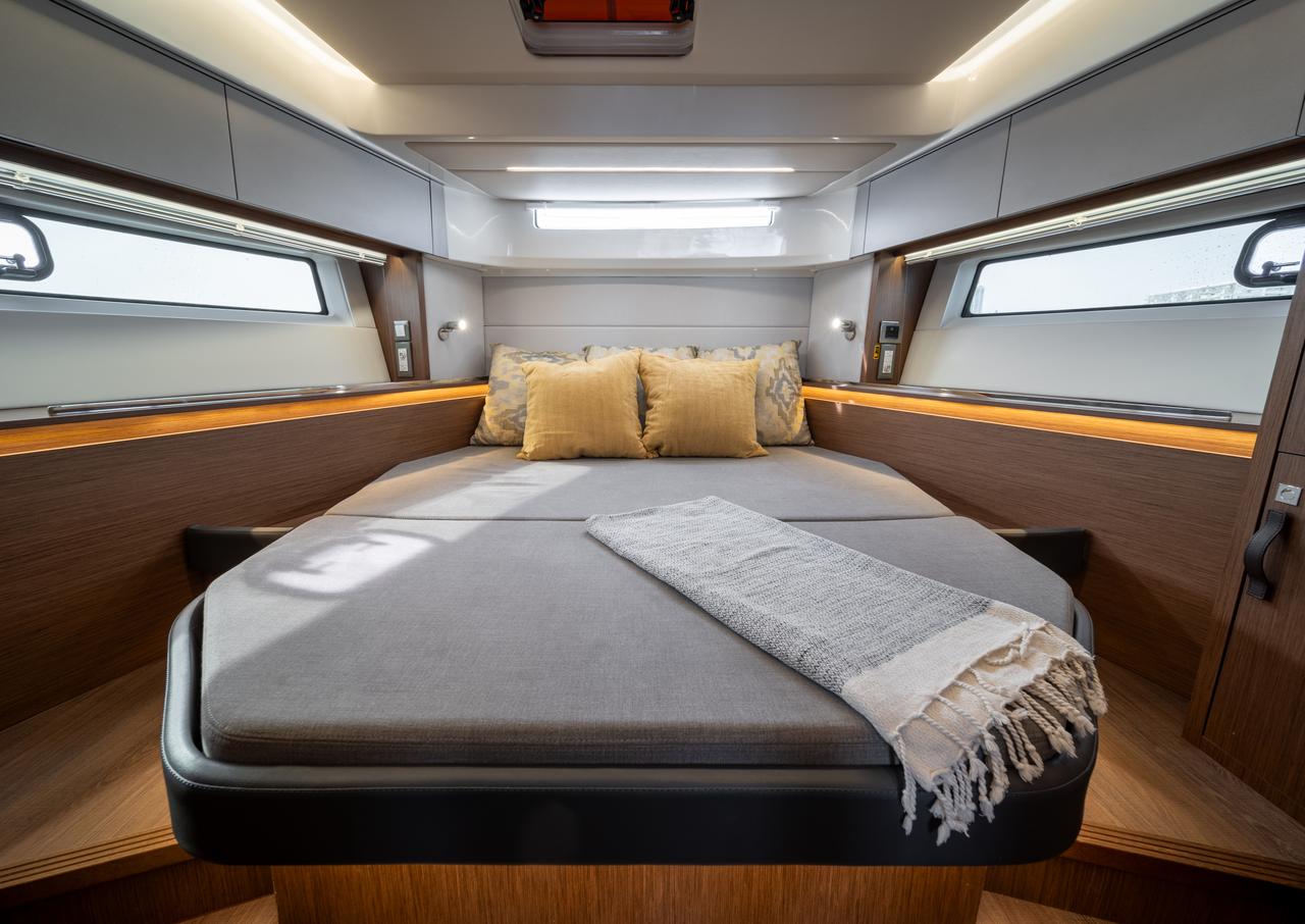 Indvendigt er båden lys og indbydende med store vinduespartier. Salonen rummer en U-formet loungesofa, der kan forvandles til ekstra sovepladser, samt en fuldt udstyret kabys. Styrehuset med panoramaudsigt kan åbnes, så cockpit og salon flyder sammen.
