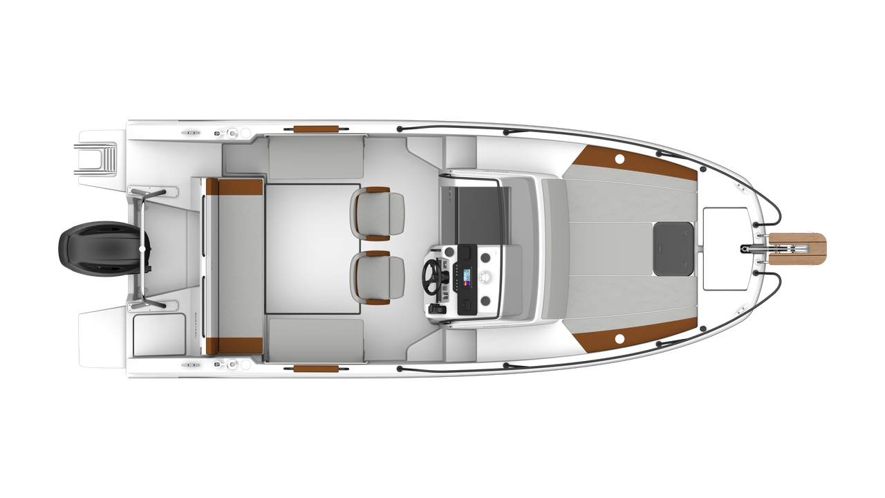 Beneteau Flyer 7 Sundeck er en moderne og elegant daycruiser med imponerende sejlegenskaber og høj komfort. Udstyret med en Mercury F150 HK påhængsmotor, leverer den kraftfuld og økonomisk sejlads – ideel til både hyggeture, fiskeri og vandsport. Med det patenterede Air Step®-skrog planer båden hurtigt og stabilt, selv i uroligt vejr, og sikrer både performance og komfort.