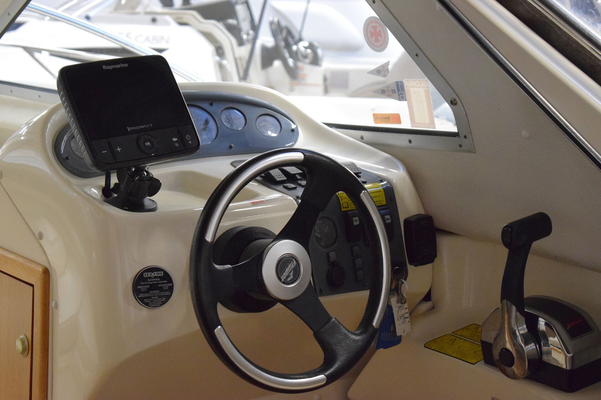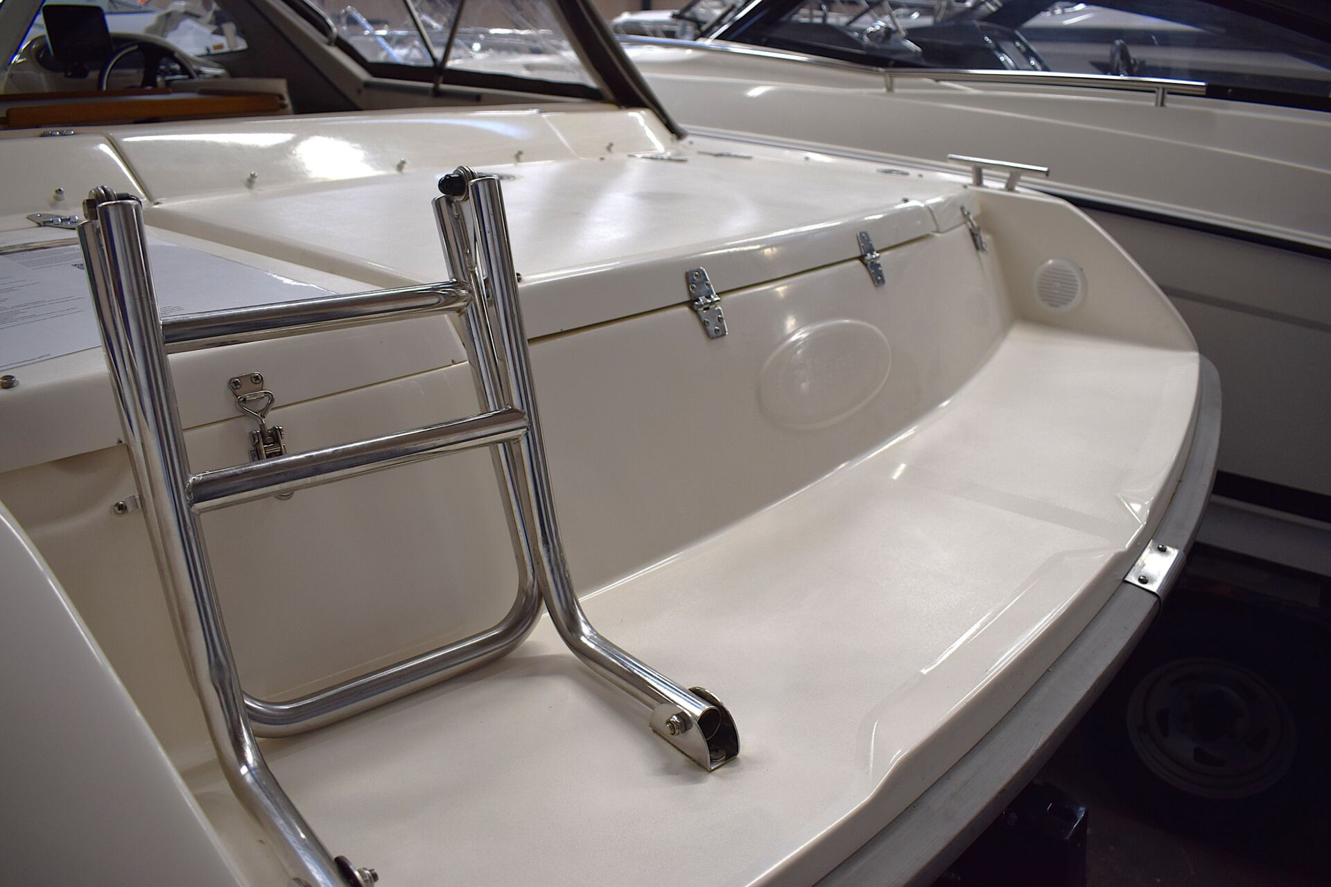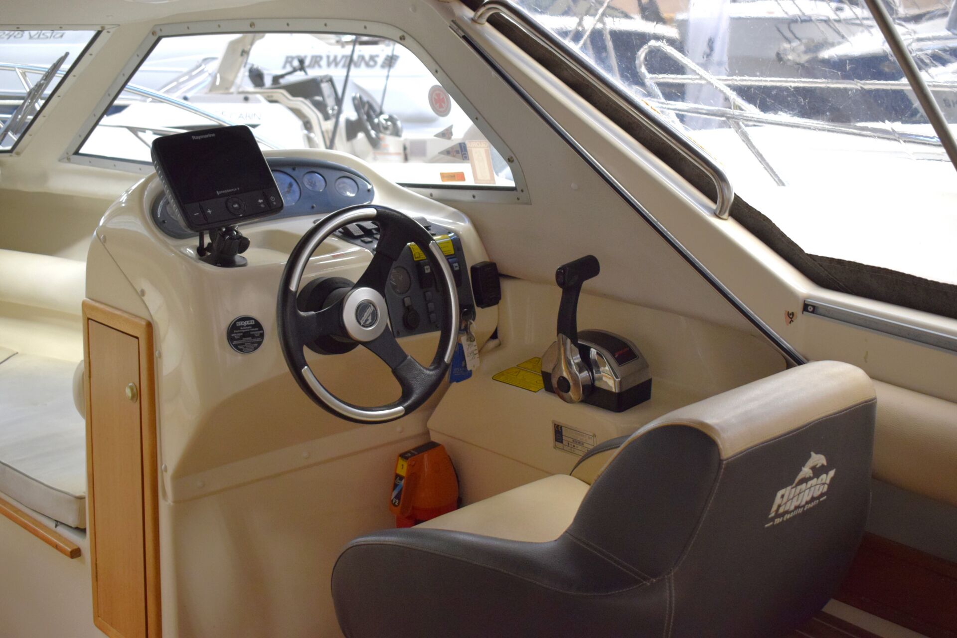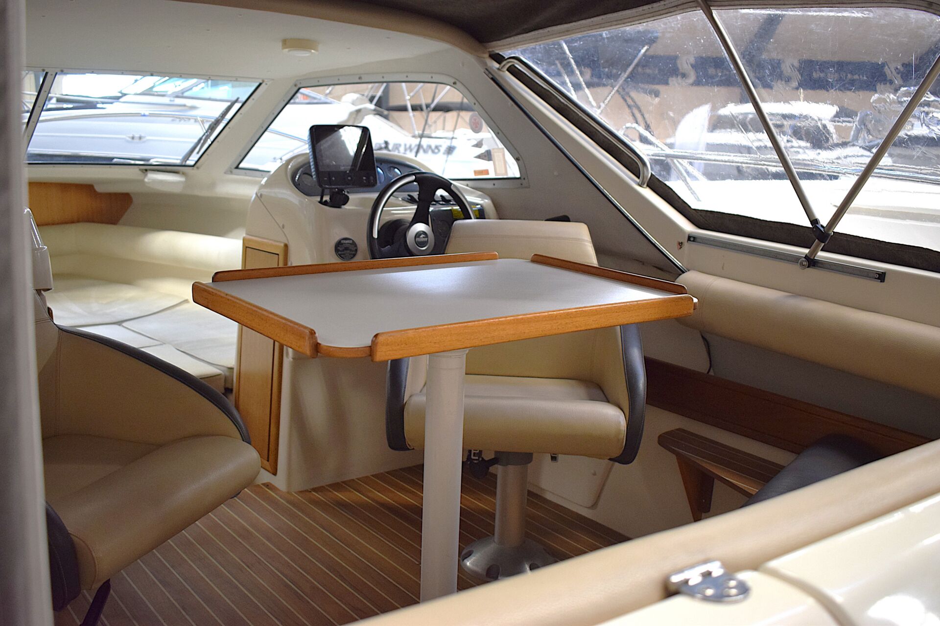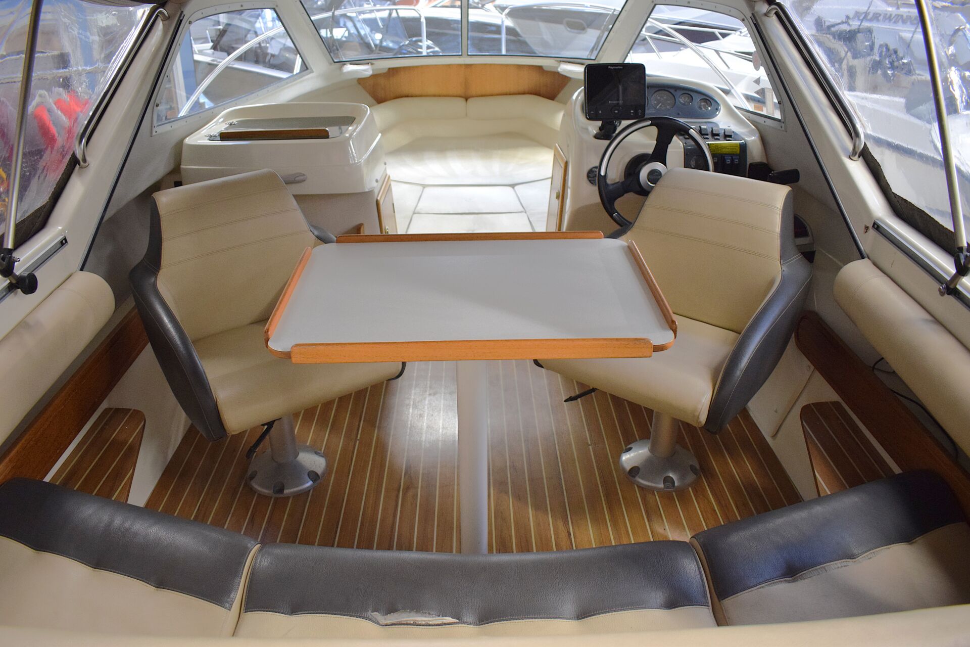 Indretningen er gennemtænkt med et rummeligt cockpit, hvor sofaarrangementet skaber naturligt samlingspunkt for familie og venner. Førersædet er drejeligt, og cockpitbordet gør det let at samle alle om frokosten i havnen eller for svaj. Teakdørken tilfører både elegance og praktisk skridsikkerhed. I kahytten er der mulighed for overnatning for to personer, hvilket forlænger sæsonen og giver friheden til spontane weekendture – her er oven i købet en alletiders Wallas kogeblus – der også kan bruges som lille varmekilde i kabinen. Badeplatformen med integreret stige gør badning og vandsport let og tilgængeligt, og den komplette kaleche giver fleksibilitet i alle vejrforhold. Navigationen klares nemt via Raymarine Dragonfly 7 kortplotter og ekkolod.