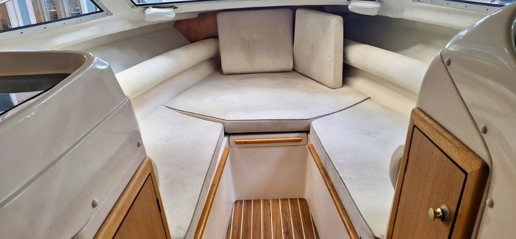 Ombord finder du et rummeligt cockpit med sofaarrangement og drejbart førersæde, teakdørk, hardtop og en komplet kaleche med ståhøjde, der gør båden fleksibel i al slags vejr. I kahytten er der plads til to overnattende, så både dagssejlads og weekendture kan nydes i komfort. Båden fremstår som et oplagt valg for den kvalitetsbevidste sejler, der søger en kombination af styrke, udstyr og klassisk design.