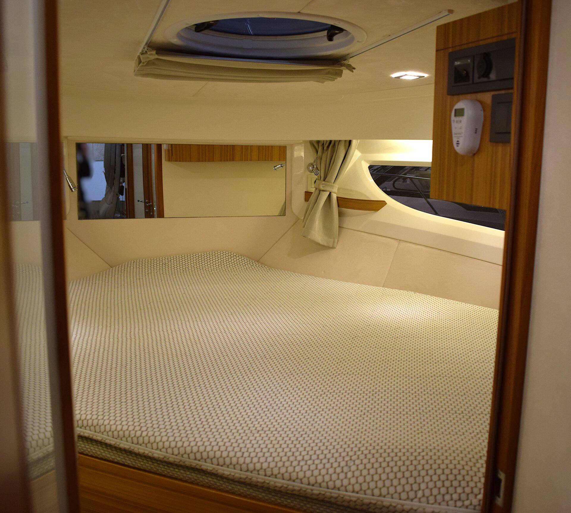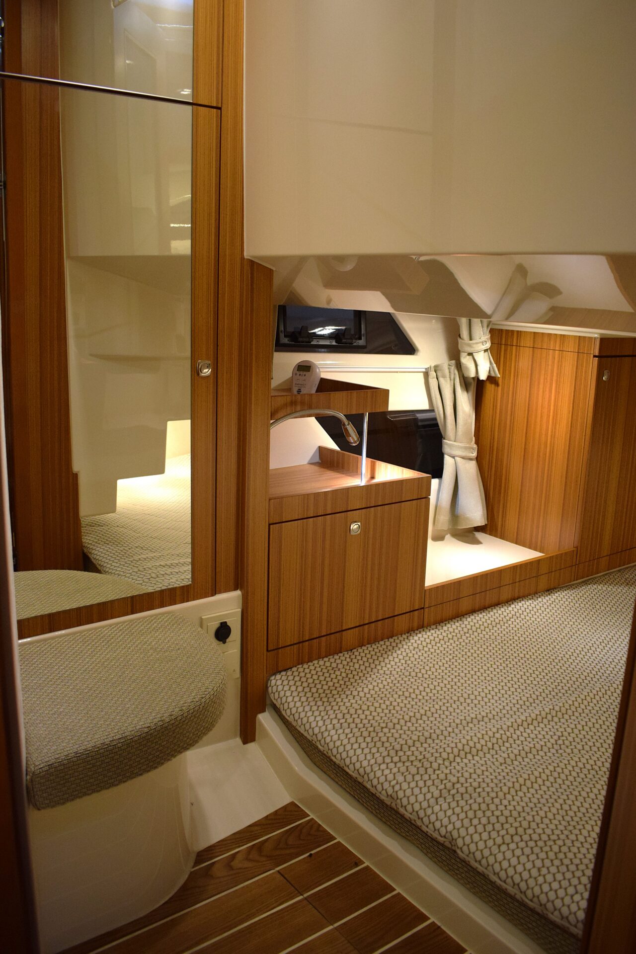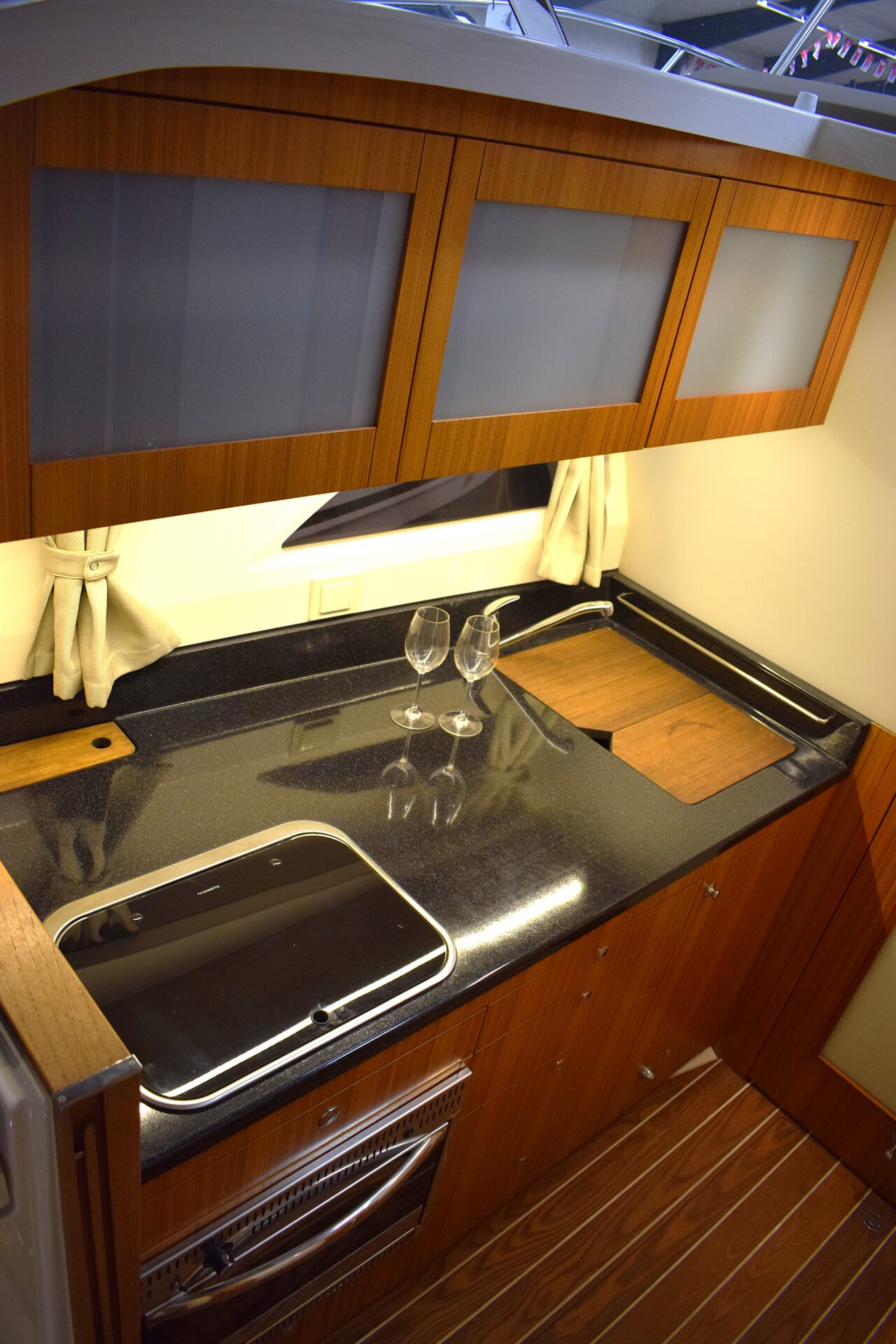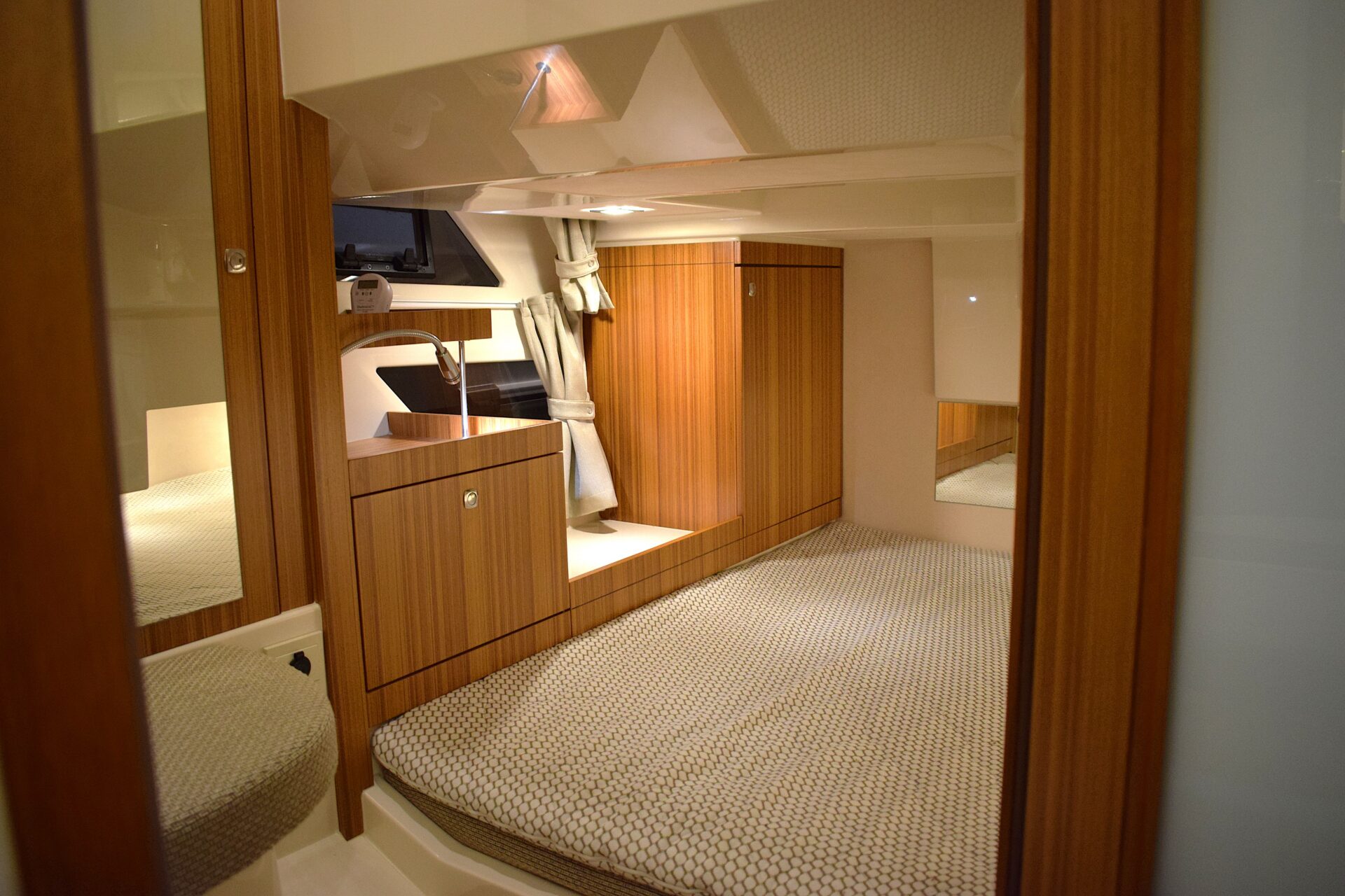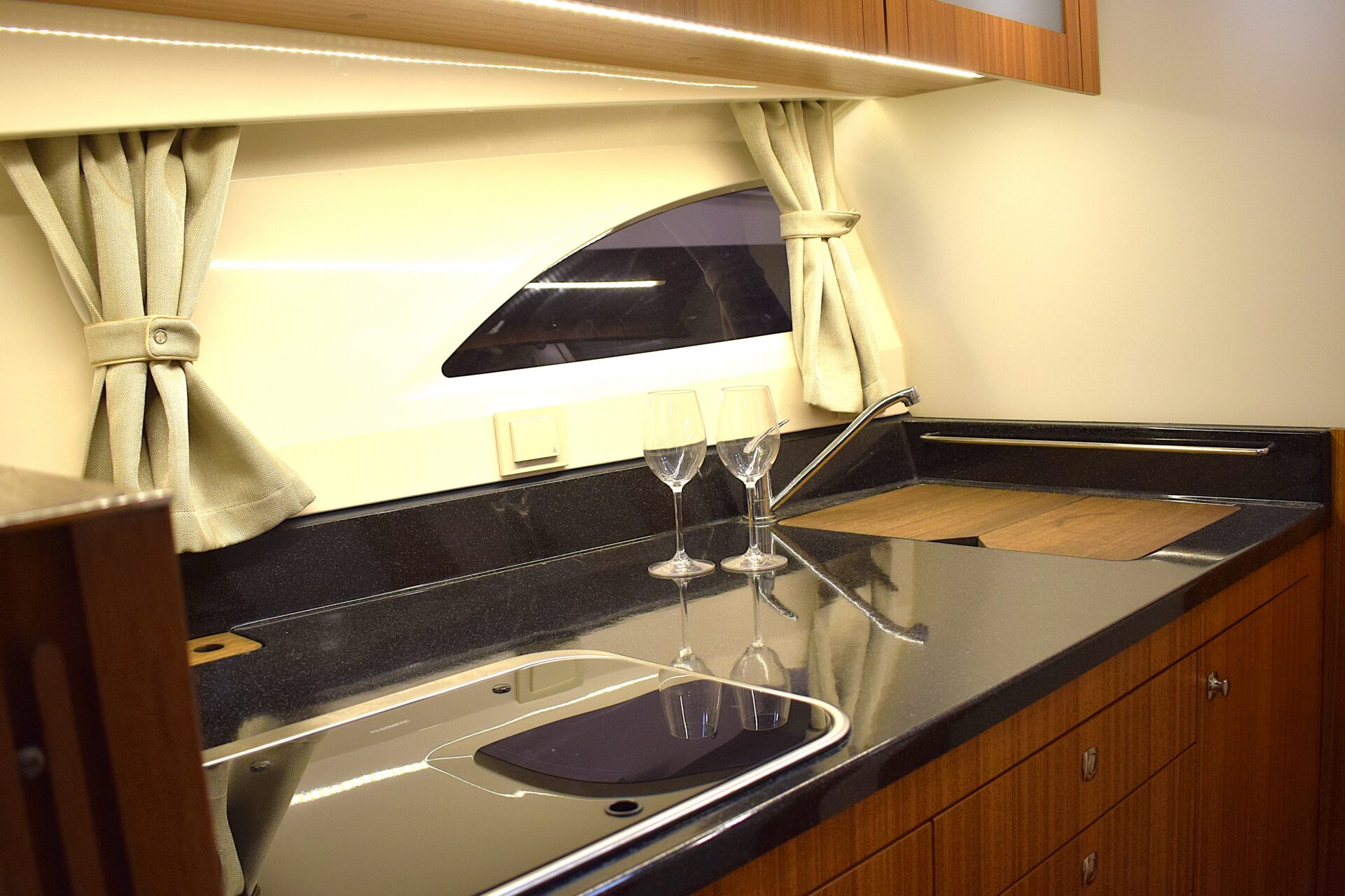 Under dæk åbner der sig en komfortabel og elegant kabine, hvor du kan trække dig tilbage efter en lang dag på vandet. Her er gode sovepladser, et fuldt udstyret pantry og et lyst, indbydende rum, der gør det muligt at tilbringe weekendture — eller længere sejladser — i den familieegnede luksus, du forventer. I denne båd er der plads til nærvær, refleksion og samtaler uden afbrydelser.