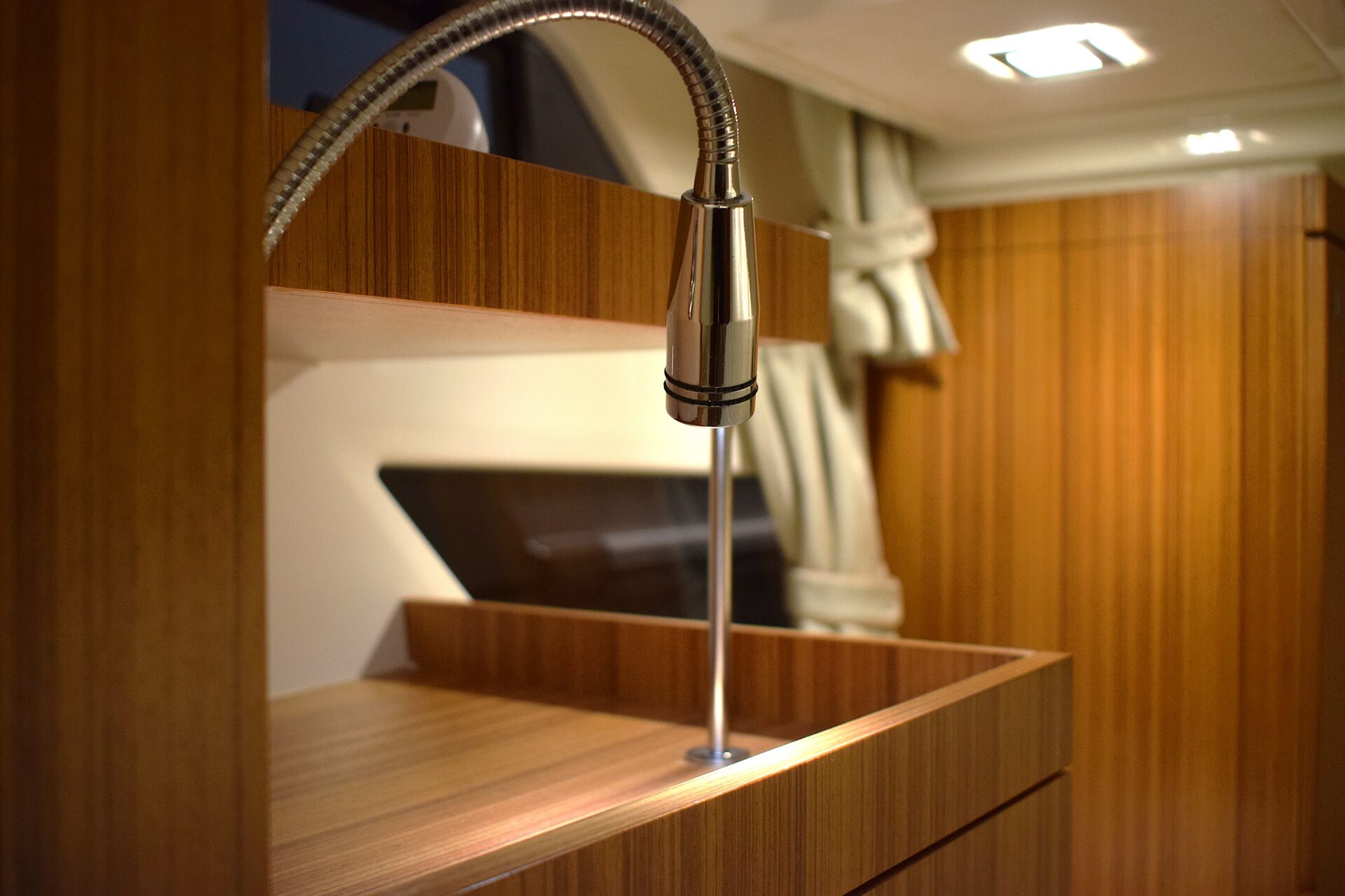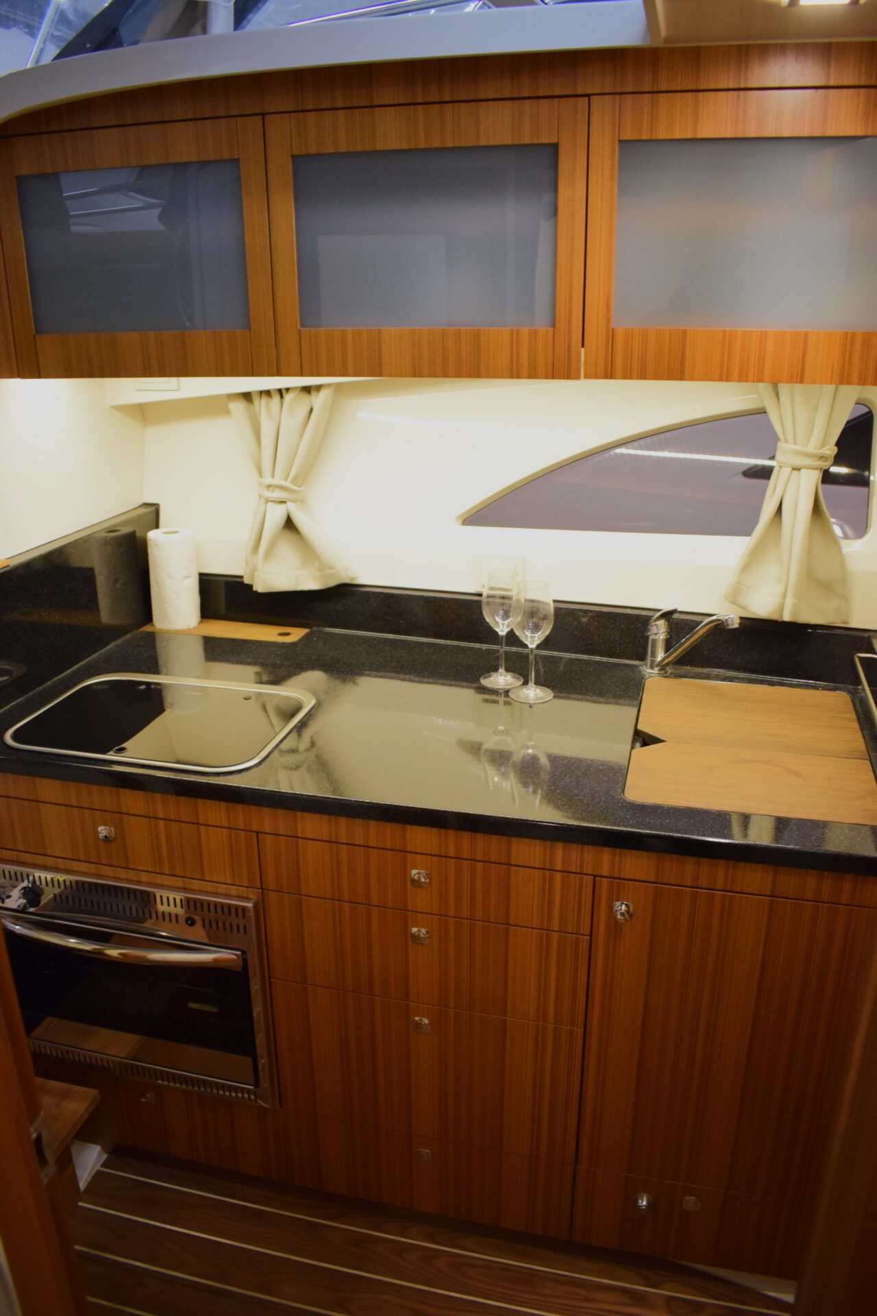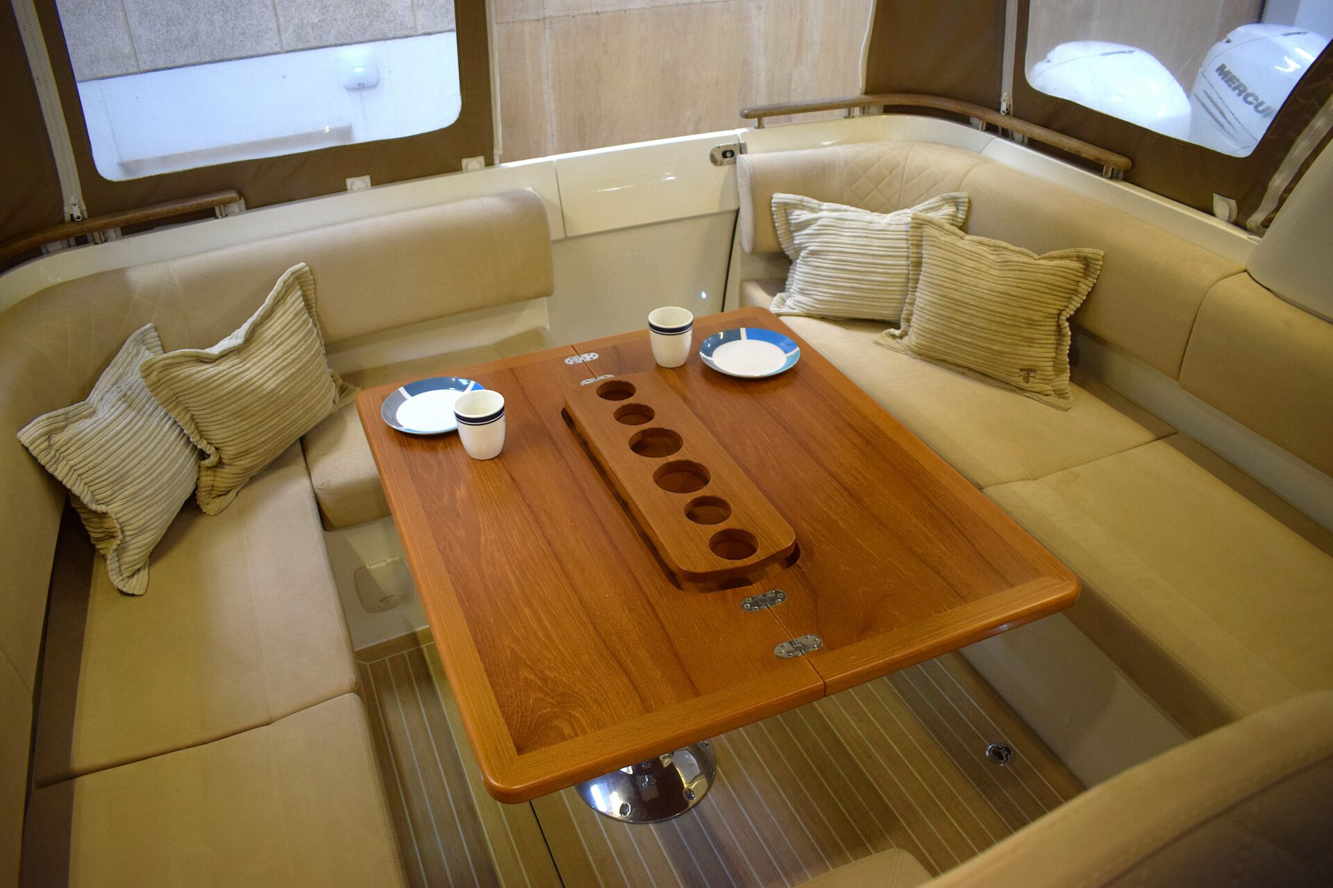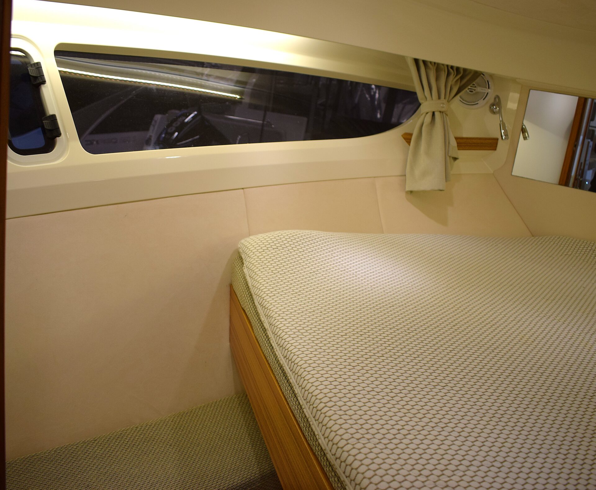 Under dæk åbner der sig en komfortabel og elegant kabine, hvor du kan trække dig tilbage efter en lang dag på vandet. Her er gode sovepladser, et fuldt udstyret pantry og et lyst, indbydende rum, der gør det muligt at tilbringe weekendture — eller længere sejladser — i den familieegnede luksus, du forventer. I denne båd er der plads til nærvær, refleksion og samtaler uden afbrydelser.
