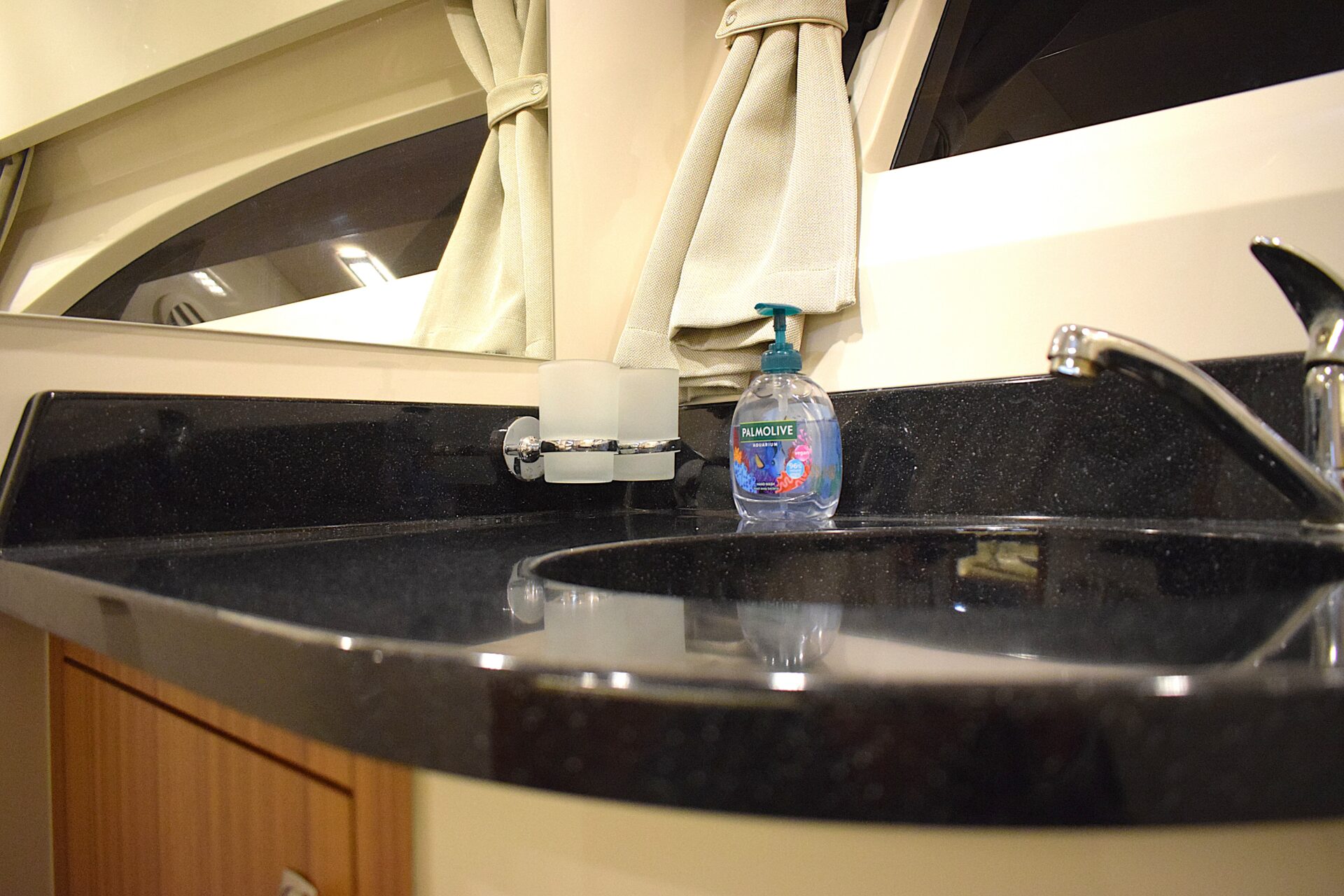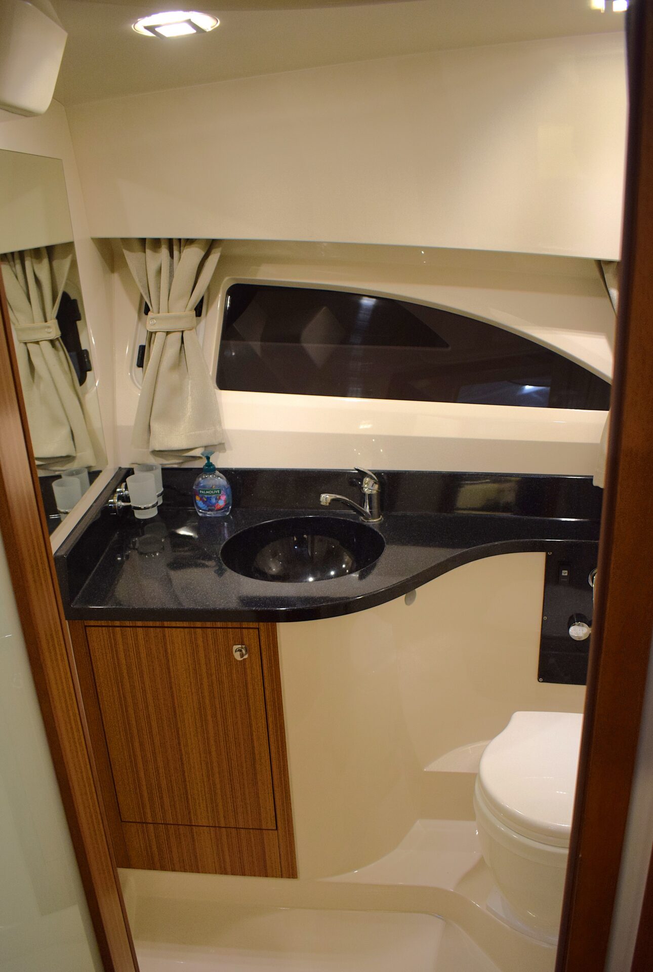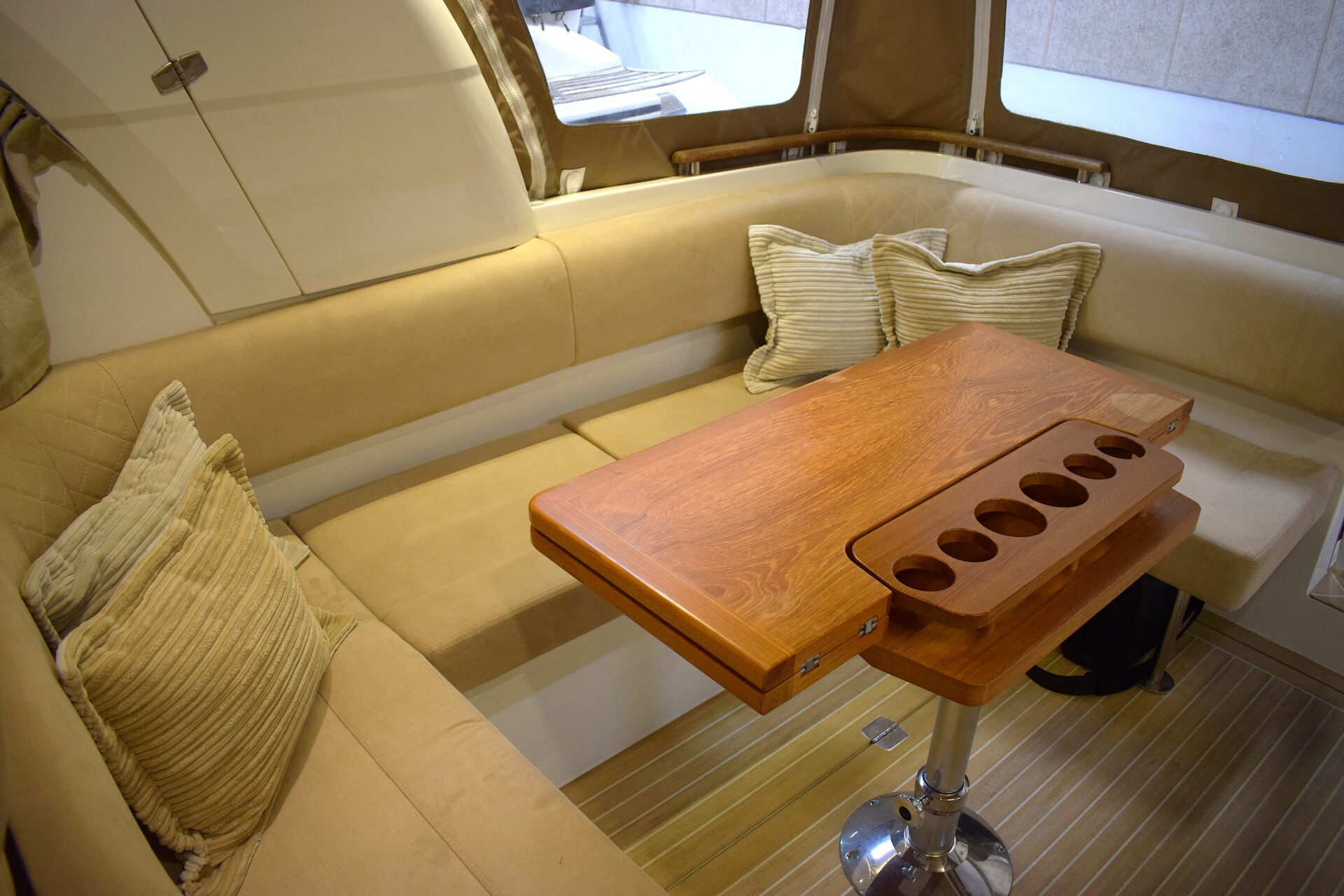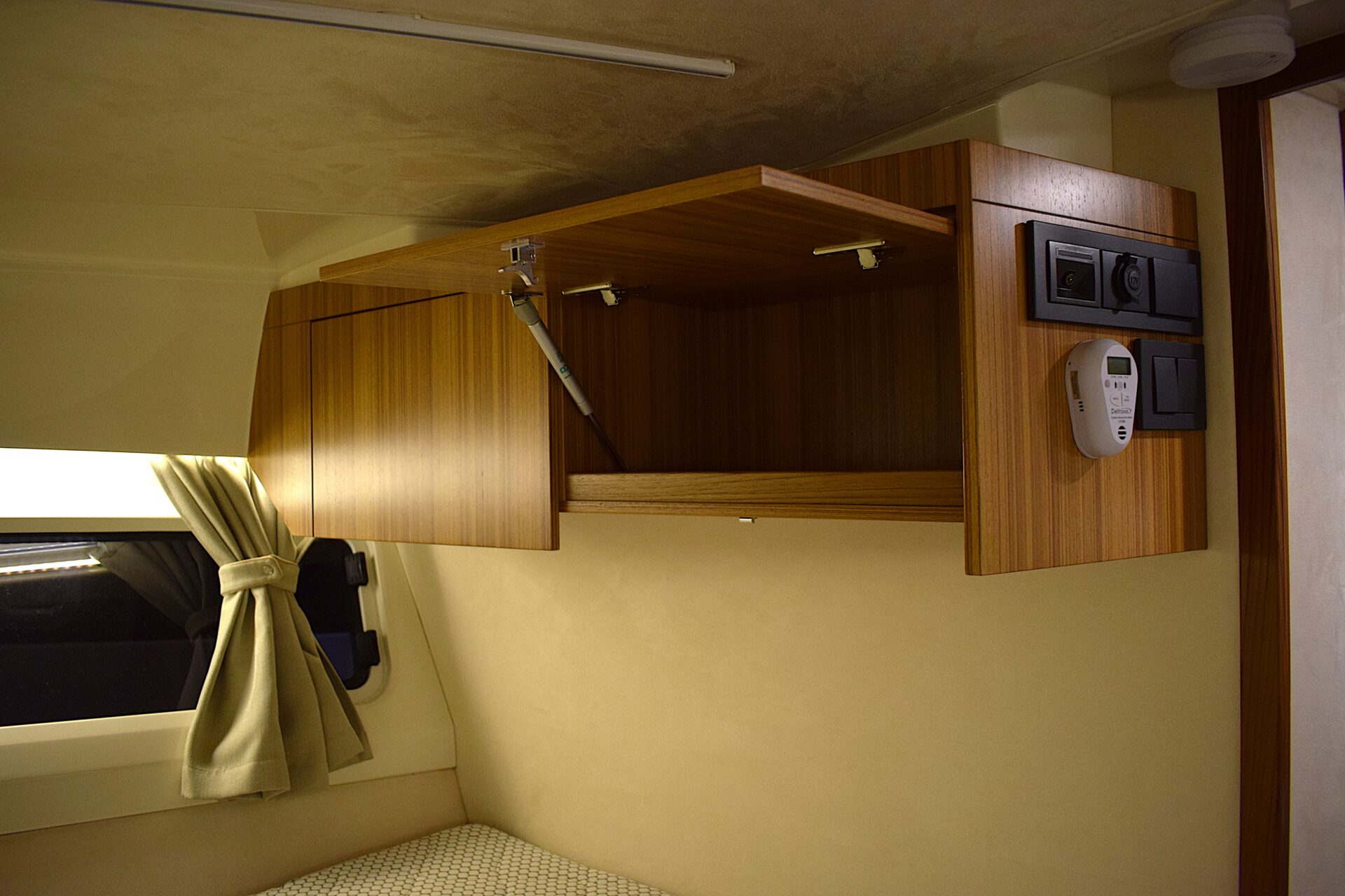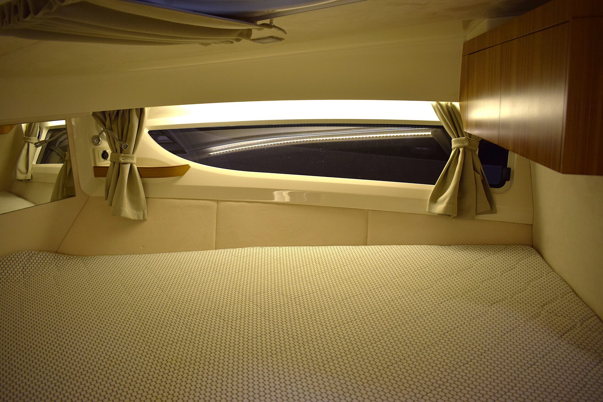 Under dæk åbner der sig en komfortabel og elegant kabine, hvor du kan trække dig tilbage efter en lang dag på vandet. Her er gode sovepladser, et fuldt udstyret pantry og et lyst, indbydende rum, der gør det muligt at tilbringe weekendture — eller længere sejladser — i den familieegnede luksus, du forventer. I denne båd er der plads til nærvær, refleksion og samtaler uden afbrydelser.