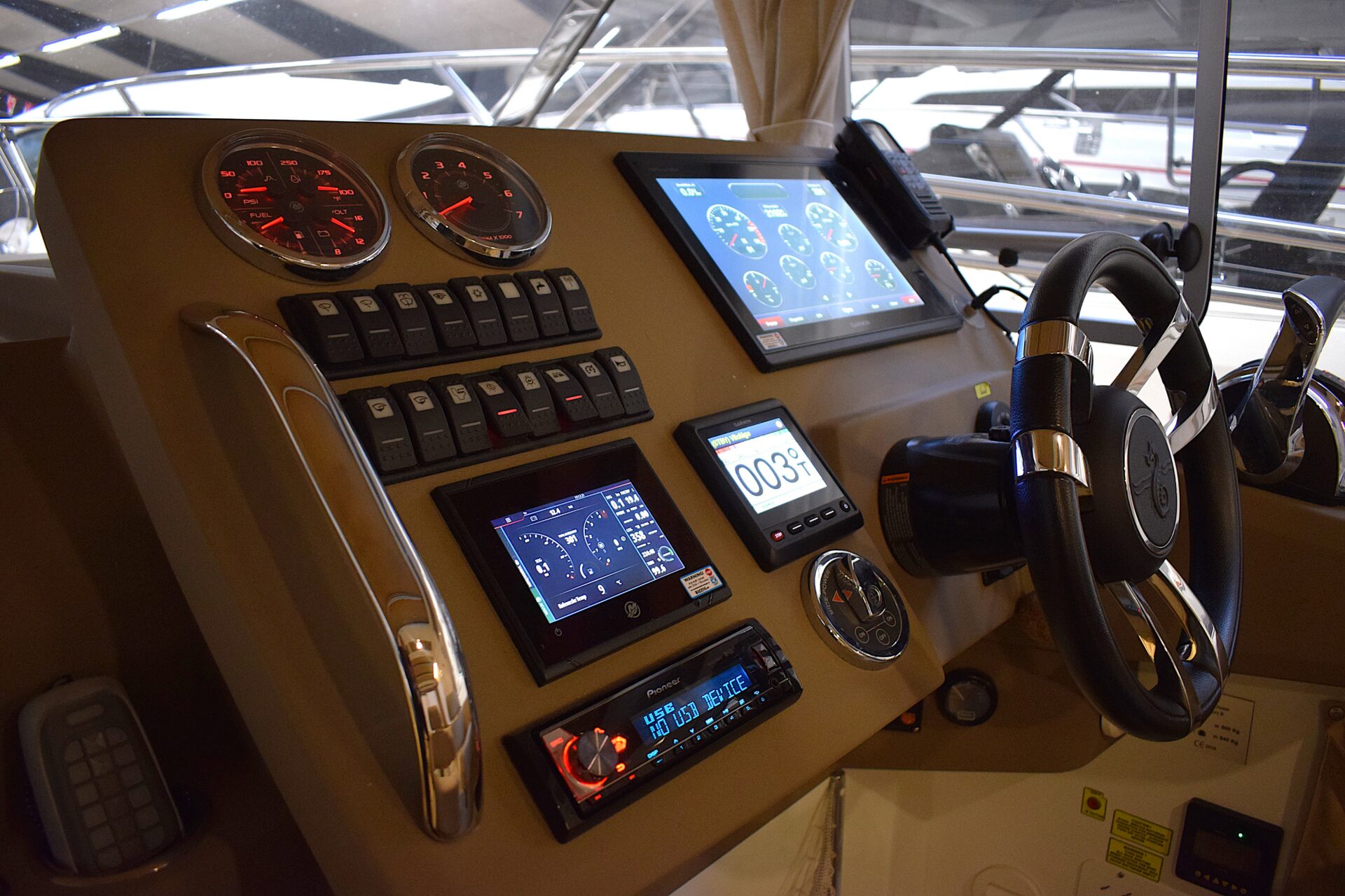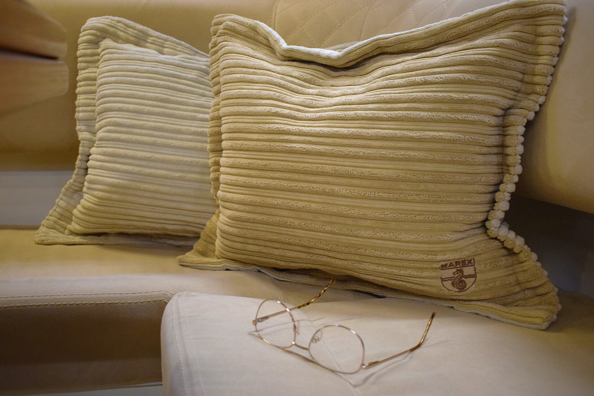 Fra det øjeblik du træder om bord, mærker du forskellen. Her er en båd med tilstedeværelse, hvor materialevalg, finish og ergonomi er udført, som det kun kan være fra en producent med øje for detaljer. Cockpittet er et rum, der inviterer til samvær, conversation og klarer øjeblikke under åben himmel, med plads til alle familiemedlemmer — uden at kompromittere det æstetiske udtryk eller den harmoniske balance i layoutet. Hele agterkalechen bliver elegant trukket frem og gemt i siderne at cockpittet under lågerne – endnu én af Marex’s smukke og ikke mindst elegante løsninger.