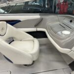 Bådens interiør er stilrent med hvide sæder og blå detaljer, som giver et friskt og moderne udtryk. Det rummelige cockpit rummer komfortable siddepladser, der indbyder til socialt samvær, mens den store solseng agter giver mulighed for afslapning i solen. En rummelig badeplatform med badestige gør det nemt at komme i vandet, hvilket gør båden perfekt til både leg og badeoplevelser.