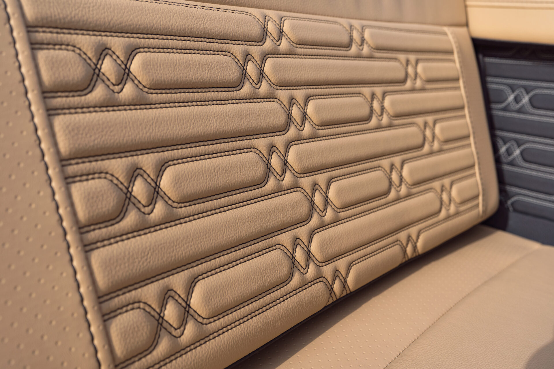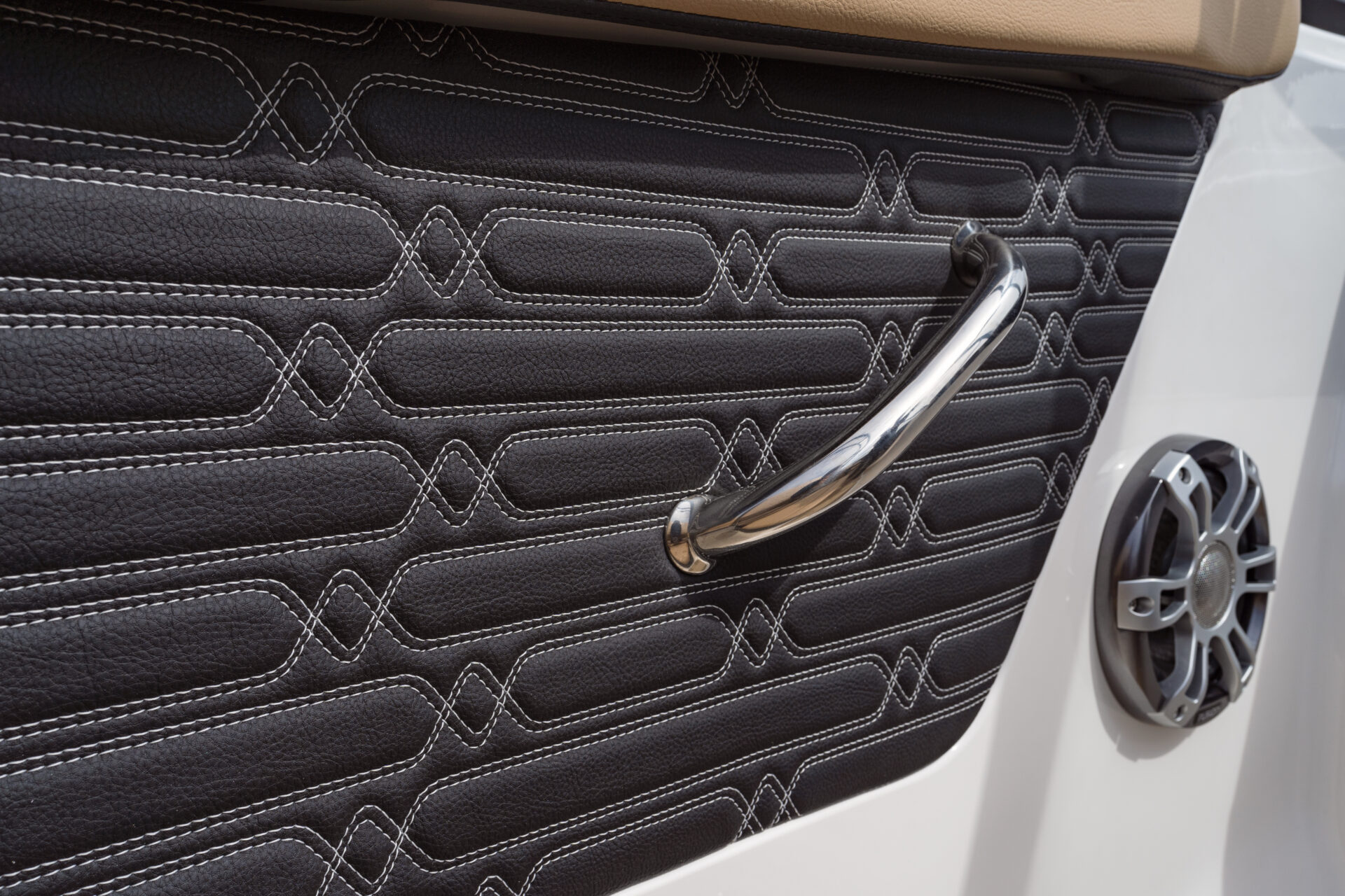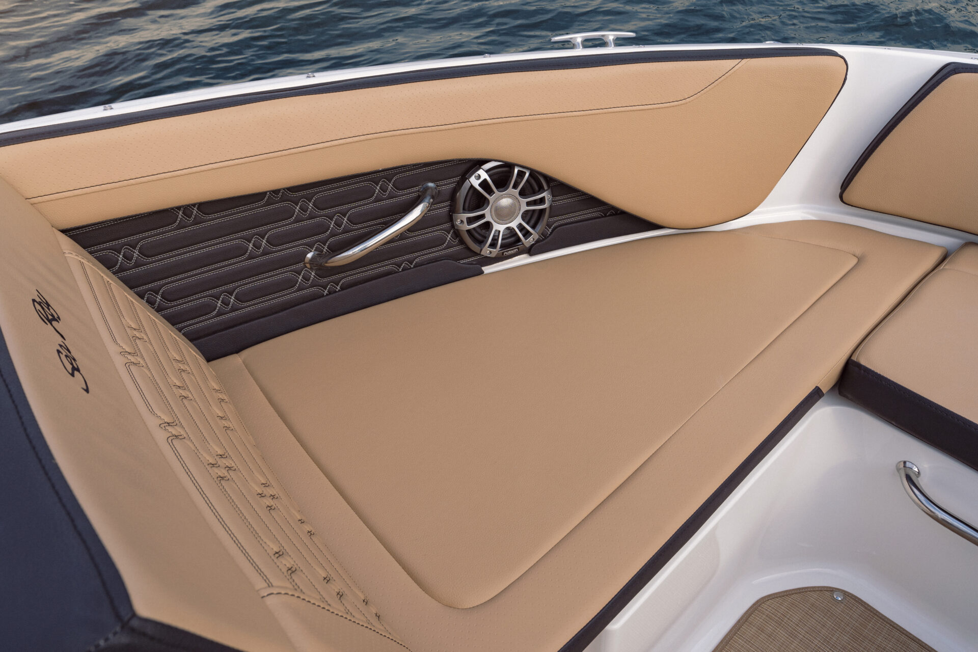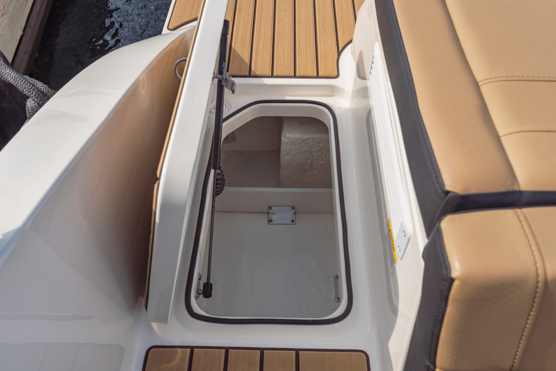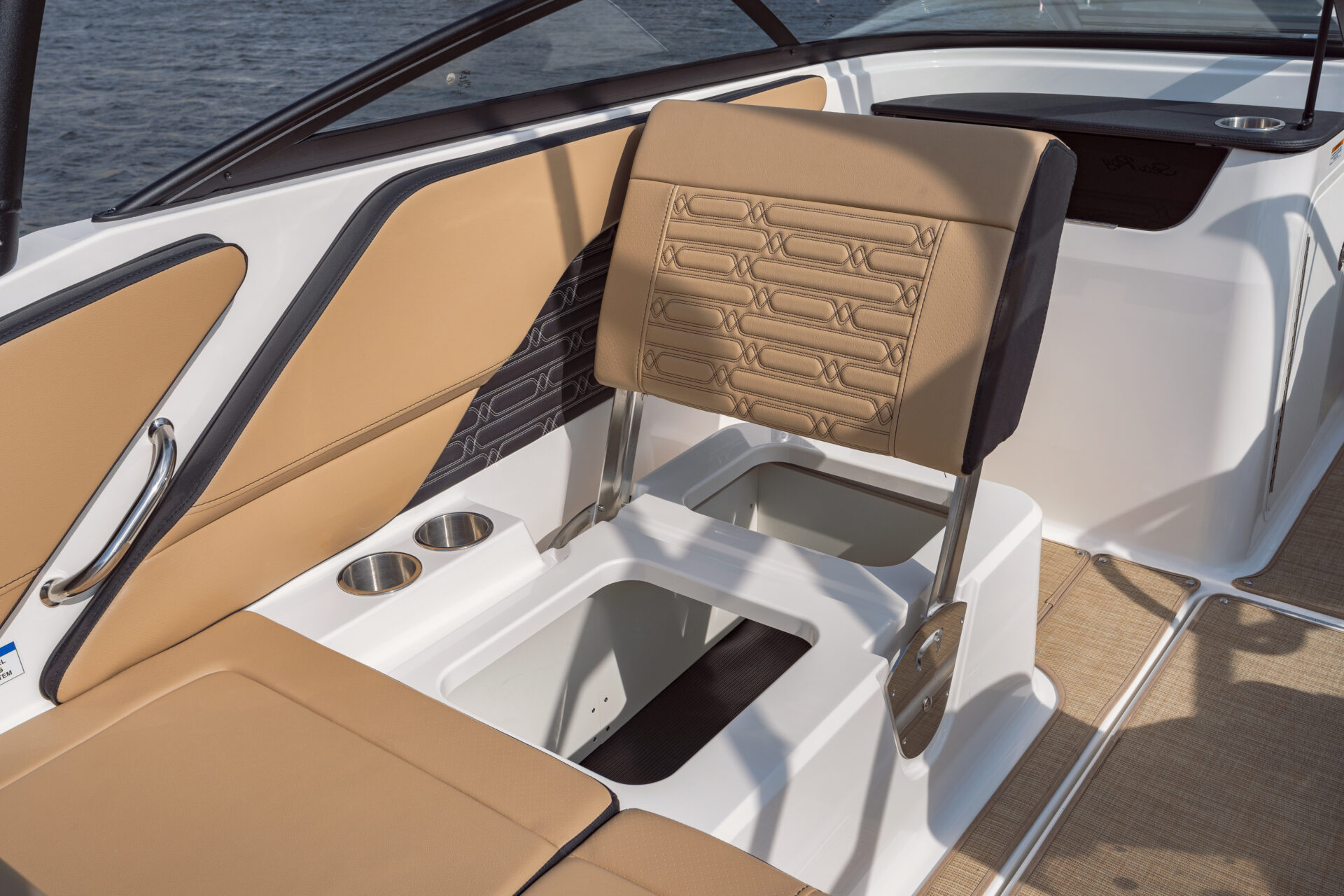 Indretningen i cockpittet er udført i den elegante Dune farve, som giver et lyst og stilrent udtryk. Dækket og badeplatformen er beklædt med brunt Sea Deck, som giver et skridsikkert og behageligt underlag.